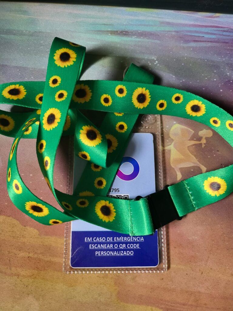 E por fim meu cordão de girassol com informações de ajuda caso eu entre em crise e algum responsável precise ser acionado, no meu caso por ser adulto os responsáveis se tornam praticamente inexistentes.